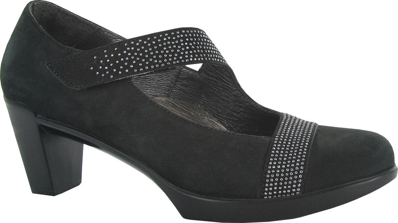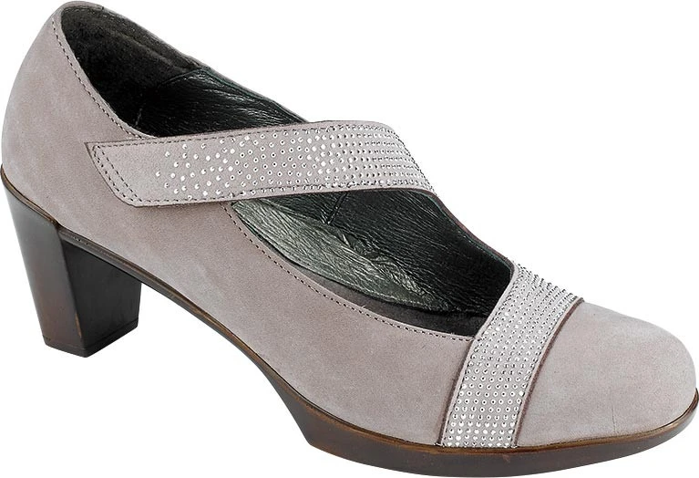 Englin’s Fine Footwear presents the women’s ‘Abbracci’ from Naot. The Abbracci is a feminine maryjane heel with delicate rivets cascading down the hook & loop strap at the instep. This style has a slightly padded heel cup for support & extra comfort. Naot’s anatomic cork & memory foam footbed is wrapped in leather & microfiber and molds to the shape of the foot with wear. This collection uses a hand-sewn stroble construction making it strong and extremely flexible. The Prima Bella Collection features a 2 3/4″ polyurethane sole with a metal shank.