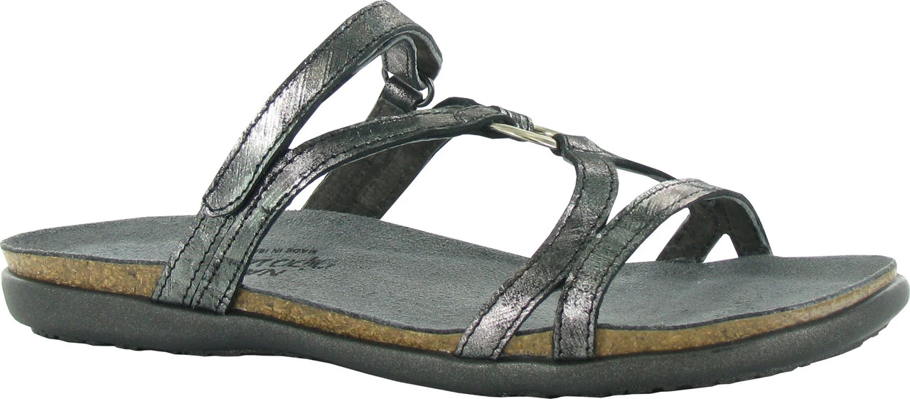 Englin’s Fine Footwear presents the women’s ‘Carmen’ from Naot. The Carmen is a feminine strappy slide with a metal ring hardware. A hook & loop at the instep, provides perfect adjustability. Naot’s anatomic cork & latex footbed is wrapped in a pampering suede and molds to the shape of the foot with wear. The Flat Elegant Collection features a .75″ TPR sole.
