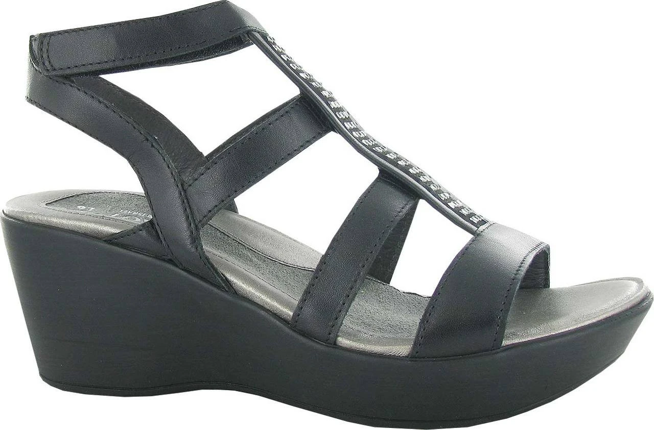 Englin’s Fine Footwear presents the ‘Mystery’ from Naot. The Mystery is a trendy 2.75″ wedge with rhinestone accents going down the middle strap. This sandal has a padded hook & loop closure at the ankle, a slightly padded front strap and gore for adjustability. Naot’s anatomic cork & latex footbed is wrapped in leather with a microfiber center to prevent slipping and molds to the shape of the foot with wear. The Impulse Collection features a TPR sole which is extremely lightweight. This sole offers the look of a 2.75″ wedge without the feel.