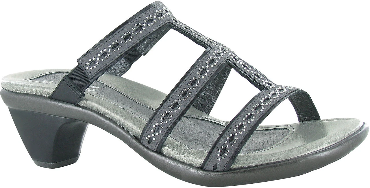 Englin’s Fine Footwear presents the women’s ‘Novel’ from Naot. Meet the Novel, a dressy slide sandal that offers style and comfort. The Novel has double gore for ease of wear and beautiful stone accents. Naot’s anatomic cork & latex footbed is wrapped in leather with a microfiber center to prevent slipping and molds to the shape of the foot with wear. The Avant-garde Collection features a TPR sole with a metal shank. This sole offers the look of a 2″ heel without the feel.