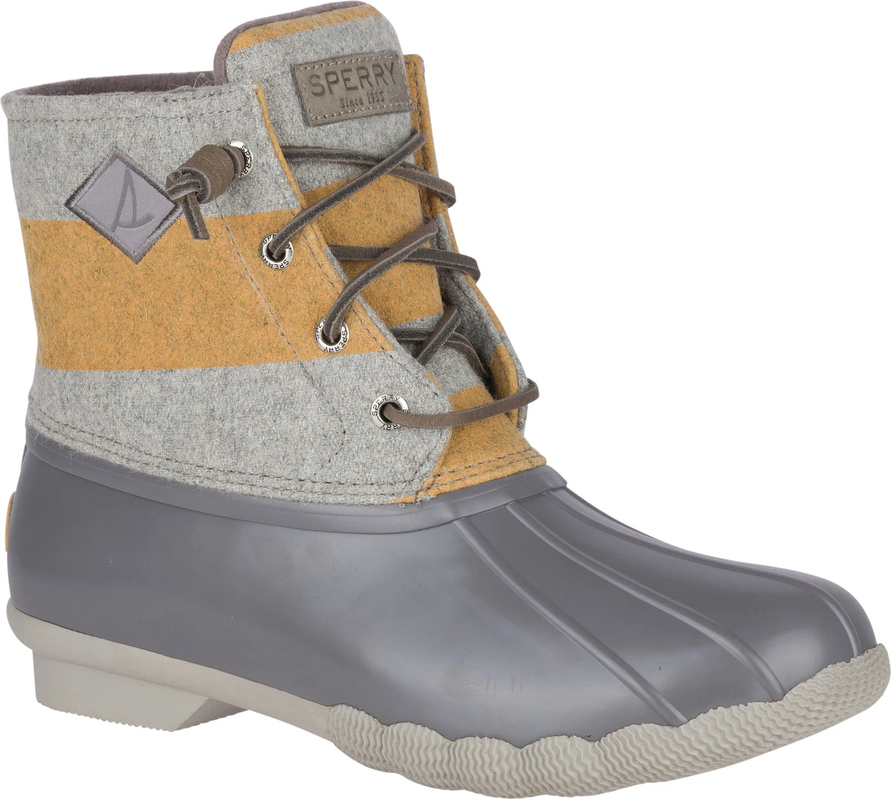 - Wool shaft with rubber duck shell, rawhide barrel lacing with rust-proof eyelets for secure fit and medial zipper for easy on/off